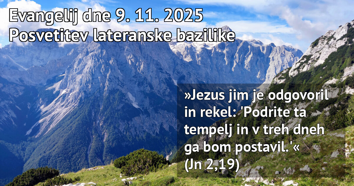 Ne gre najprej za papeževo baziliko v Lateranu (Rim). Gre za svetišča oseb: moških, žensk, otrok, starih in mladih. Gre za svetišča družin, za skupnosti kristjanov: »Ali ne veste, da ste Božji tempelj in da Božji Duh prebiva v vas? Če kdo podira Božji tempelj, njega bo Bog končal. Kajti Božji tempelj je svet, in taki ste vi« (1 Kor 3,17). Jezus, prav imaš: ne zavedamo se, da smo Božje svetišče. Spomni nas danes, da v nas prebiva Sveti Duh. Da je on izvir žive vode, ki vse očisti, ozdravi naša okužena in mrtva morja ter prinaša življenje v najbolj puščavske - mrtve predele našega življenja. Spomni nas, da je naše telo svetišče Svetega Duha. Da so svetišče naši odnosi: med možem in ženo, v družini, v občestvu. In tako, kot si postavil podrt tempelj tvojega telesa v treh dneh, obudi, pozidaj, oživi tudi nas. Kajti ti delaš vse novo!